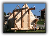 Osim velikih, masivnih drvenih kuća od trupaca proizvode se i male vrtne kućice. Izrađuju se po starinskom 'ambar sistemu' sa određenim inovacijama i poboljšanjima po pitanju drvo-drvo tesarskih spojeva. Drvena konstrukcija vrtnih kućica je izrađena od masivnih trupaca promjera fi 20cm do 30cm. Ispuna između trupaca su pravokutne grede od 50mm. Krovna konstrukcija je također od trupaca te podaskana. Kao krovni pokrov može biti crijep, lim ili šindra. Stolarija je drvena. Dimenzije vrtnih kućica mogu biti od 3x3m pa sve do 5x5m. Za razliku od ostalih vrtnih kućica koje ćete pronaći na tržištu ove vrtne kućice se odlikuju masivnošću te postojanom kvalitetom. Posebna pažnja se posvećuje sjedanju ispune tako da se ne može desiti da prilikom rasušivanja dođe do velikih rupa na spojevima što je dosta čest slučaj kod ostalih proizvođača. Cijene vrtnih kućica se kreću od 3.000€ do 15.000€, ovisno o izvedbi, kompliciranosti i veličini. Dolje prikazujemo nekoliko fotografija vrtne kućice 3x3m , model "Velebit". Video prikaz vrtne kućice 3x3m , model "Velebit". |